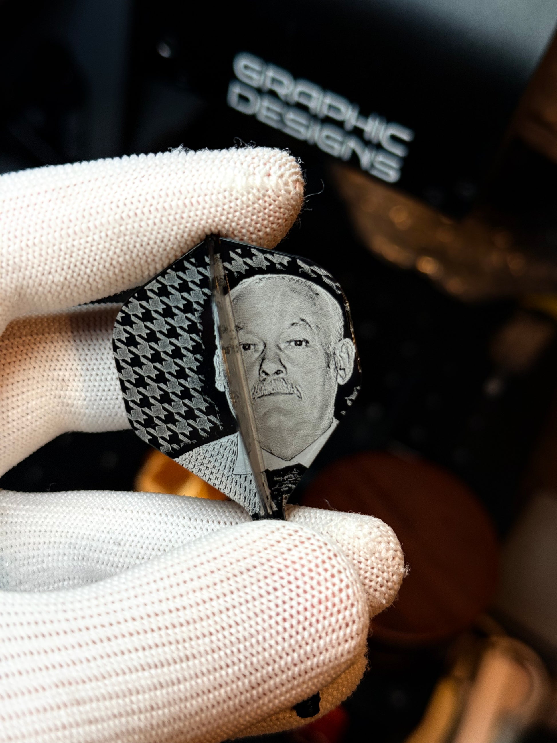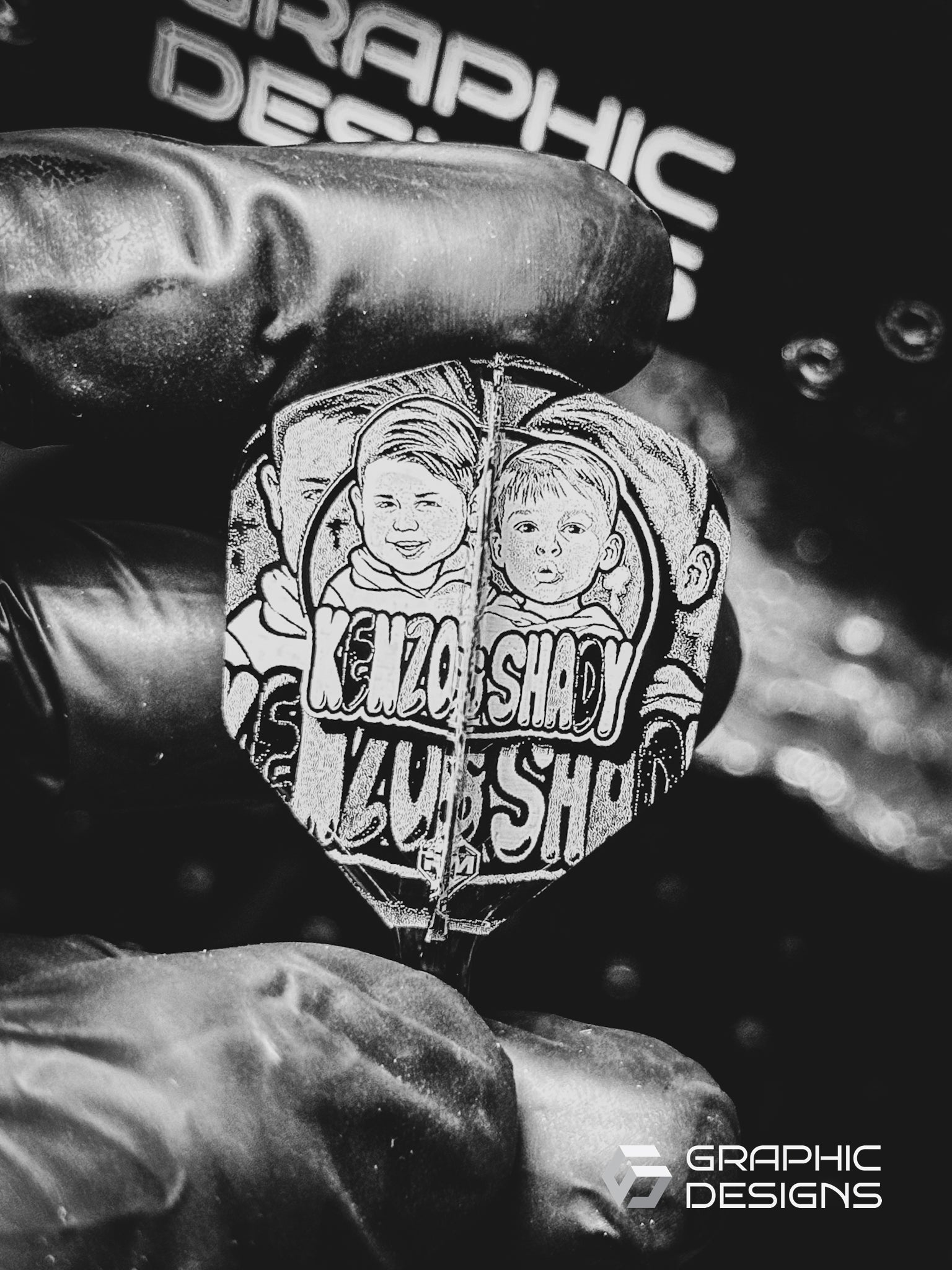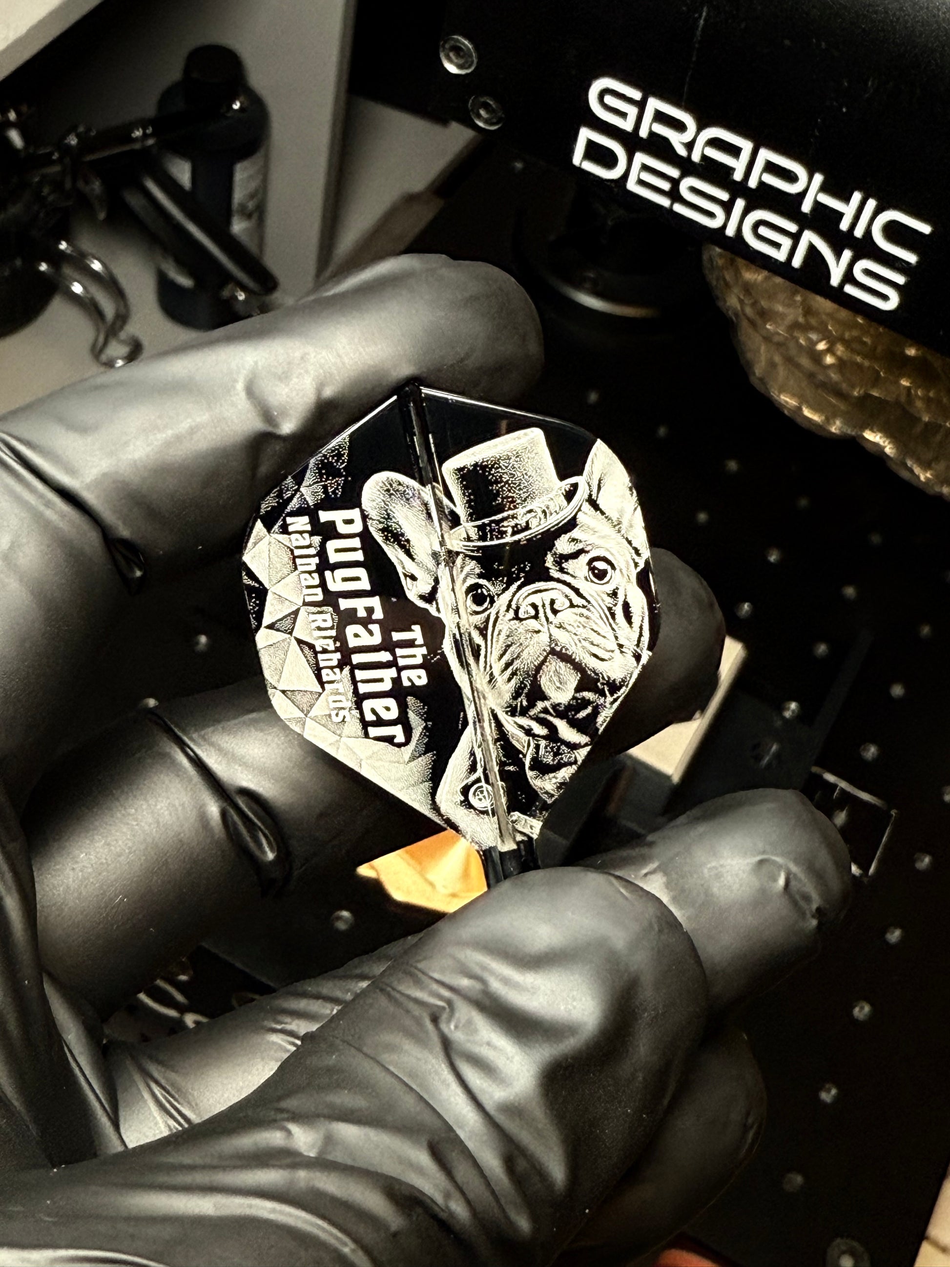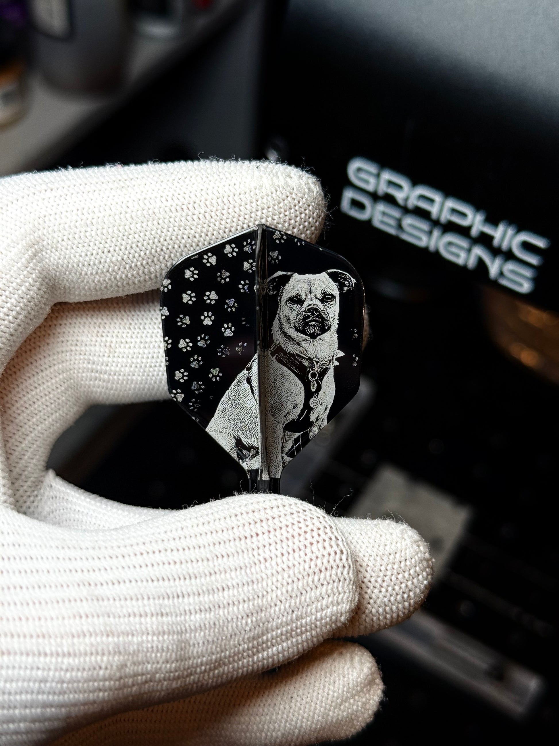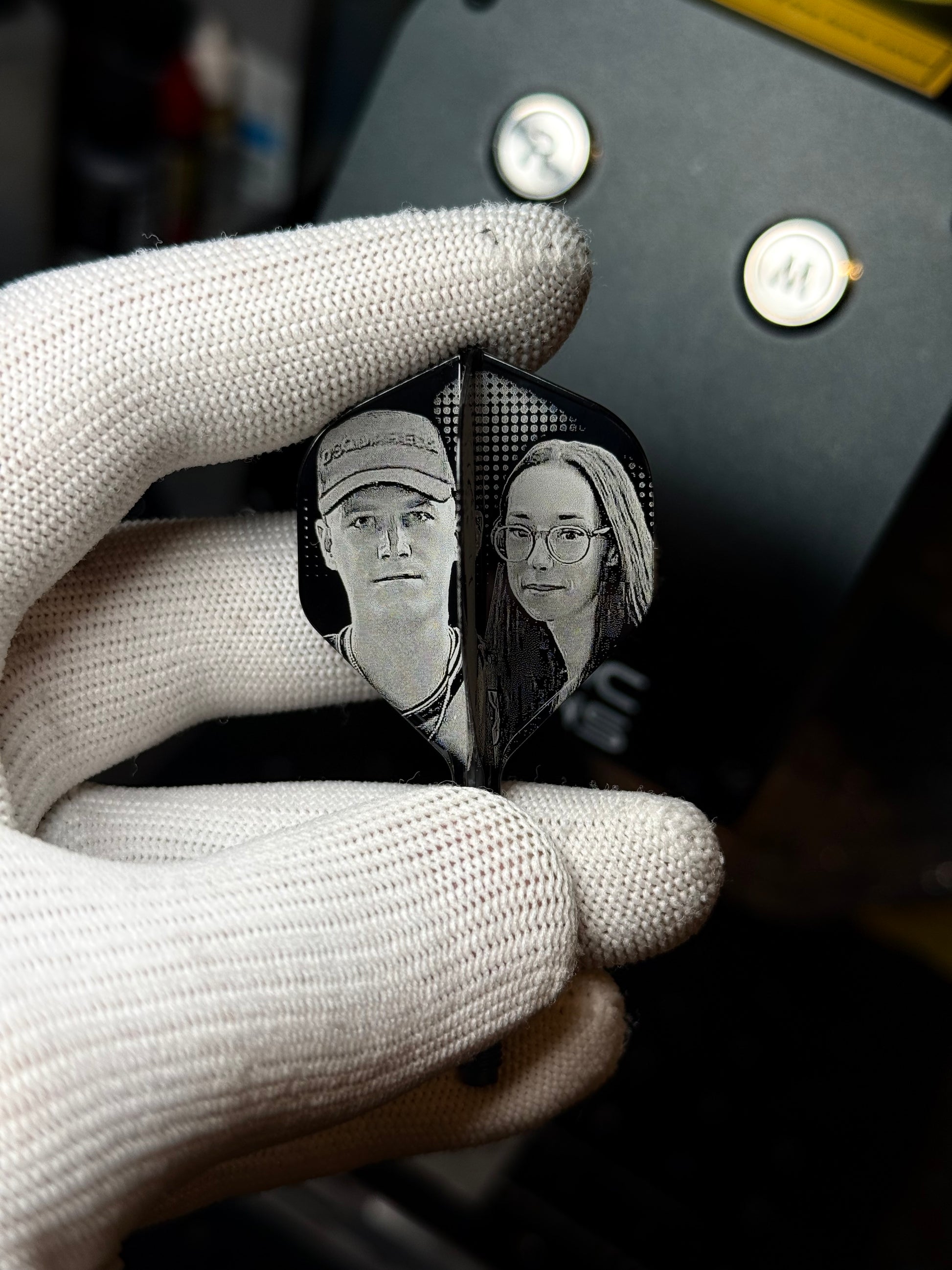 Stand out on the oche with personalized dart flights! Each set is laser-engraved with your custom logo, image, or photo for a unique and professional look.